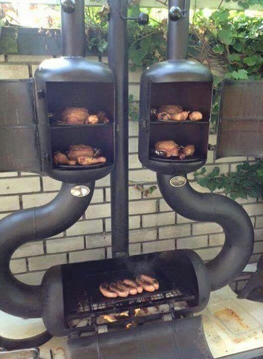 Такая конструкция мангала вместе с коптильней под силу только мастерам экстра класса.