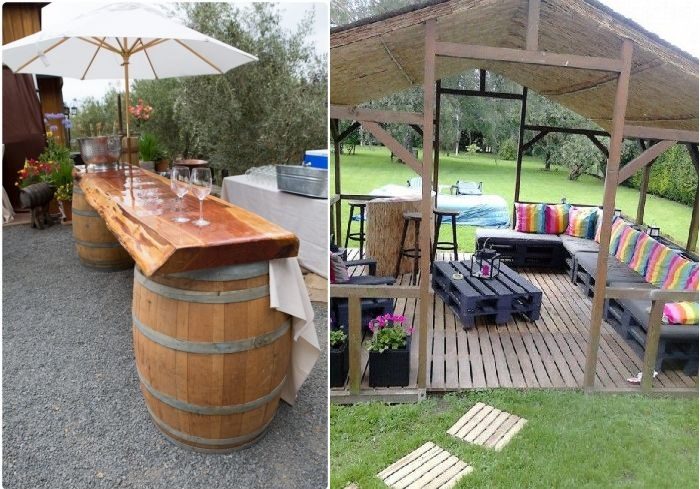 Сделайте мебель для зоны барбекю из паллетов или бочек.
