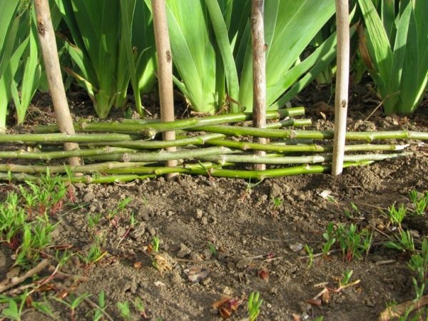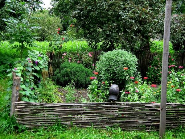 Лучшим материалом для плетня считается ивовые прутья. Но им ни в чем не уступают, например, кусты малины, вырезанной для обновления сада. Комбинируя прутья от разных кустов, можно создать оригинальную цветовую гамму плетня и его рельефный рисунок (свивая прутья разной толщины).