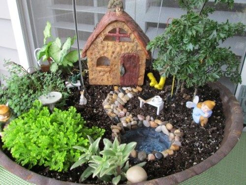 Эффектнее всего выглядят и в жизни, и на фото мини-сады, повторяющие ландшафт приусадебного участка. В этом случае воссоздают загородное имение с домом, садом, водоемом, клумбами, малыми архитектурными формами, садовыми дорожками, фигурками животных. Это настоящий мини-мир, в котором можно полностью раствориться и забыть о проблемах.