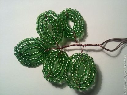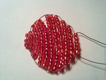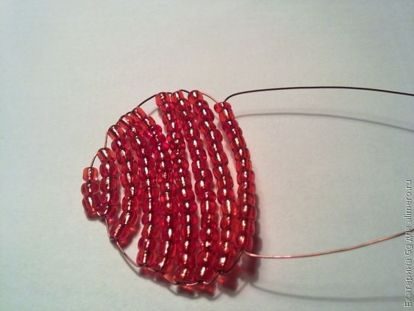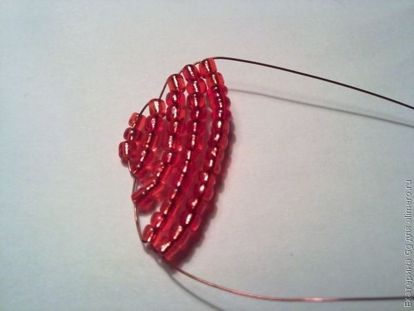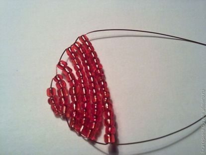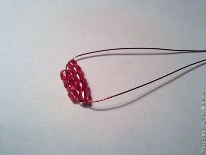 1.Набираем на проволоку длиной 75 см 8 красных бисеринок и одним концом проволоки проходим навстречу другому концу через5 бисеринок.