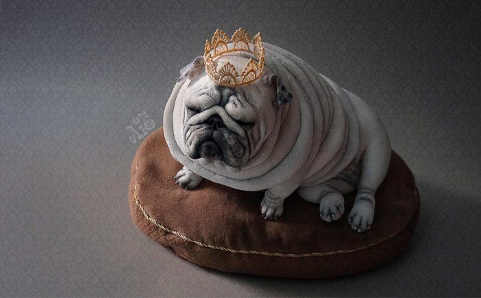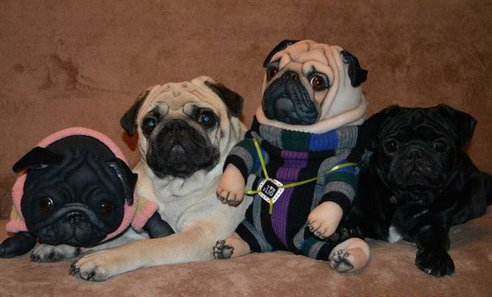 Часто бывает очень нелегко различить на фотографии, где сидят живые собачки, а где арт-мопсы от Лю.