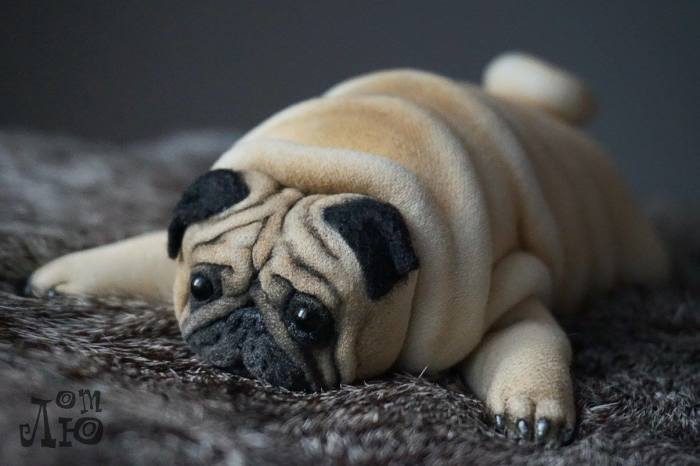 Симпатичные щеночки настолько реалистичны, что с трудом верится в то, что все они сделаны из самых обычных капроновых колготок, поэтому их очень сложно отличить от настоящих, особенно глядя на фотографии. И совсем неудивительно, ведь талантливая мастерица чаще всего создаёт их по снимкам с реальными мопсами, чьи хозяева мечтают заполучить ещё и маленькую реалистичную копию своего питомца.