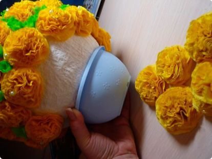 Каждую салфетку я разрезала пополам и скручивала в длинную тонкую трубочку. Каждую трубочку я сворачивала улиткой, закрепив концы клеем. У меня получались розочки. Я приклеивала из термопистолетом к шарику так, чтобы не оставалось пустых мест.