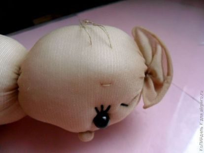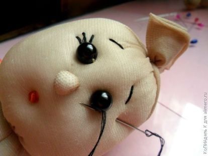 А от глаза сразу к местонахождению рта и вытягиваем иголку в то же место, откуда мы начинали сшить.