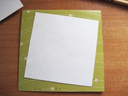 Из картона вырезаем прямоугольник размером 12,5*25см и сгибаем его аккуратненько пополам (ластиком удаляем остатки карандаша), из бумаги для акварели — квадрат размером 10*10см, и приклеиваем его немного наискосок.
