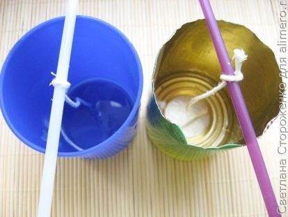 Отмеряла и отрезала фитиль. Привязала один его конец к трубочке для напитков и разместила его максимально по центру форм.