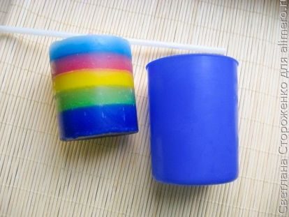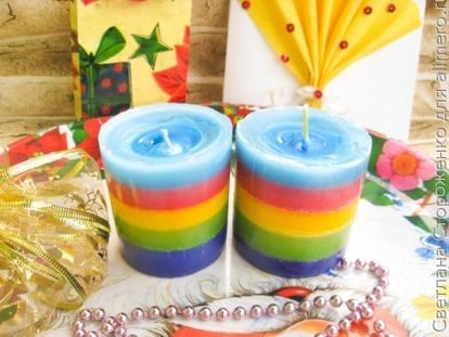 С идеей подарка я определилась. Осталось придумать, чем их украсить. Долго я думала, крутила-вертела свои запасы бусинок и ленточек, и решила, что сделаю свечи интересными и необычными без каких-либо дополнительных украшений. Например, сделаю их полосатыми, как радуга.