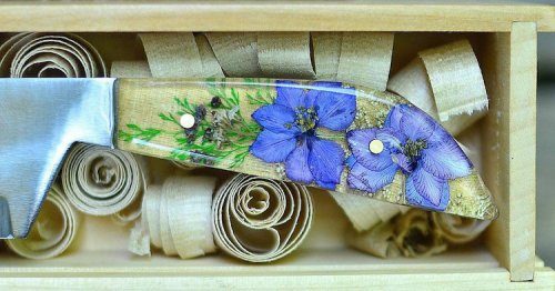 Внутри рукояток ножей заключены настоящие сухие цветы и листья, идеально застывшие во времени в прозрачной смоле. Каждая рукоятка делается по индивидуальному заказу клиента, который может выбрать из множества прессованных цветов и листьев.