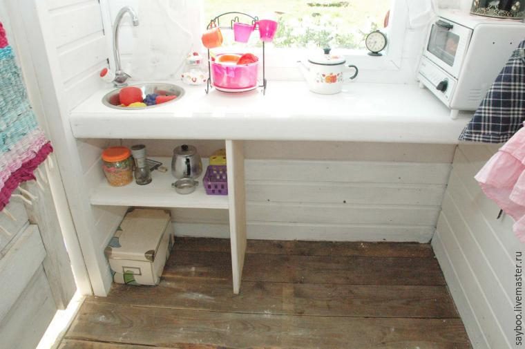 Теперь немного про интерьер и наполнение дома.Главное наше сокровище, импровизированная кухонька, сделана из массива доски, обычной железной тарелки и советского крана. Столешница, единственная в доме покрашенная алкидной эмалью, просто потому, что ей обычно достается больше всех. Фасадную часть столешницы дополнила наличником, что придало ей завершенный вид.