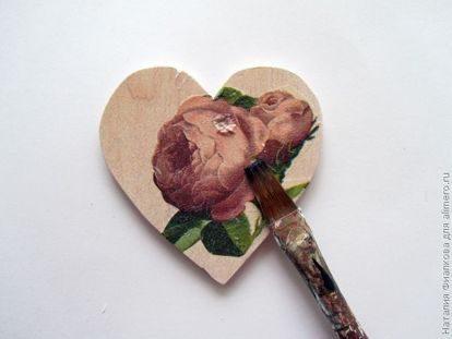 Клеем для декупажа приклеиваем вырезку к деревянной заготовке. Клей наносим сверху на вырезку с помощью кисточки.