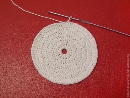В следующих 4 рядах расширяем круг за счет провязывания двух столбиков с накидом из одной петли: 3й ряд через каждые 2 петли, 4й ряд — через каждые 3 петли, 5й ряд — через каждые 4 петли, 6й ряд через каждые 5 петель.