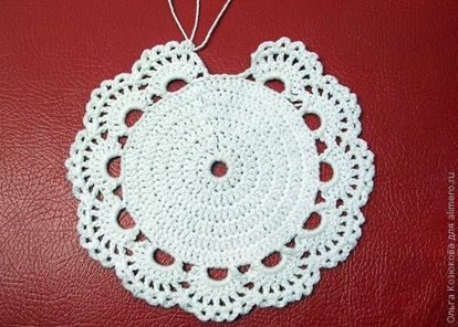 Обвязываем получившийся кружок арками из 5 в.п. в каждую 4ю петлю предыдущего ряда. Не замыкаем круг, около 2 см. непровязанными. Работу разворачиваем.