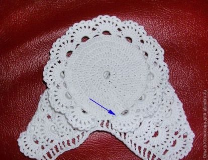 Рабочую нить привязываем к краю кружка (стрелка на рисунке) и обвязываем затылочную часть чепчика по схеме.