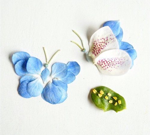 Прогуливаясь по окрестностям, она внимательно собирает лепестки, листья, камешки и веточки, которые затем аккуратно оформляет на бумаге и фотографирует, запечатлевая нежную красоту цветков и яркие цвета, прежде чем они увянут.