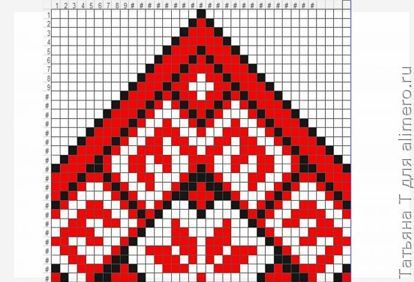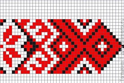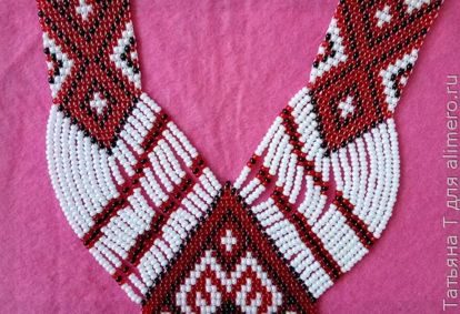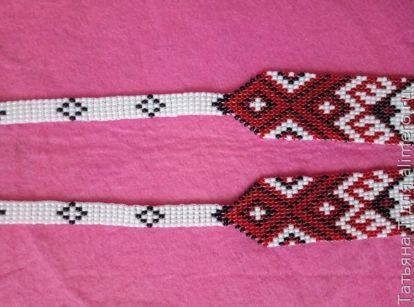Гердан, с которого я срисовала орнамент, мне не слишком понравился в деталях сборки — хотелось чего-то более яркого и неординарного. Так появилась идея белой тесемки с черными ромбами (длину нужно подгонять индивидуально).