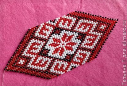 Доплела до конца два ряда. Первый (с красной бисериной в центре) — средний, он не повторяется. Все остальные рядочки дублируются. Так как рабочая нить вышла из крайней бисеринки центрального ряда, то и плести я продолжила с повтора второго ряда (согласно рисунку).