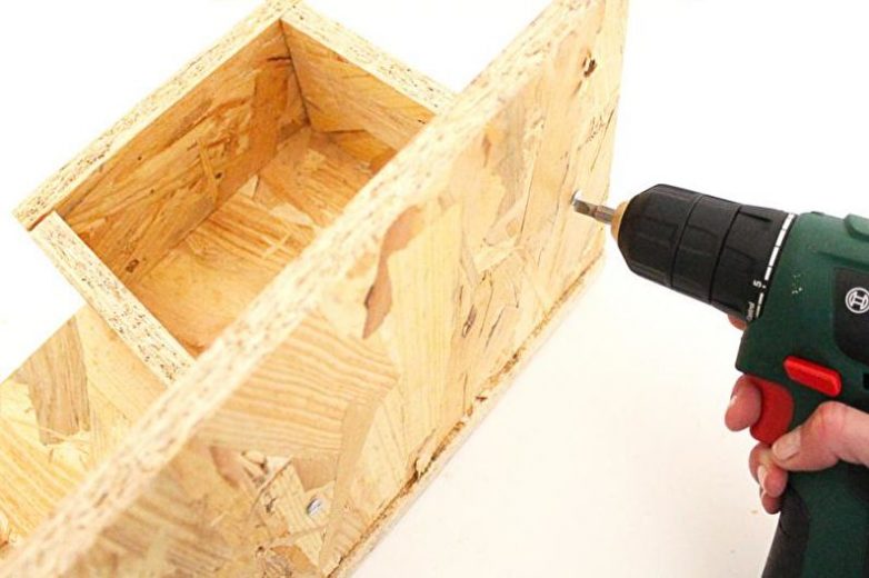 Определитесь с размерами ящика-кашпо для цветов и проведите замеры, оставляя с левой стороны пространство для крепления. Отметьте места крепления – посередине и по углам каждой стенки ящичка. Просверлите их тонким и толстым сверлом. Используя саморезы, прикрутите к полке ящик.