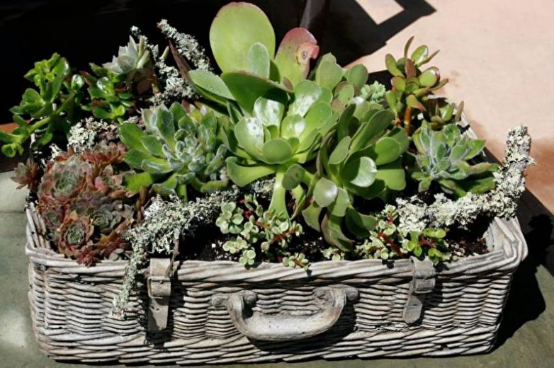 Чемодан-кашпо готов! Поставьте его в подобранное место и полюбуйтесь своим творением. В дальнейшем, при осуществлении полива, следите за количеством жидкости, ведь если ее будет слишком много, растение может погибнуть, так как здесь отсутствуют отверстия для дренажа. Это касается всех видов кашпо.
