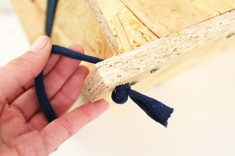 В горизонтальную доску проденьте веревку с завязанными концами. Протяните ее до большой доски, расположенной вертикально, и также завяжите узлы. Готово! Положите на дно ящика клеенку и высадите туда цветы или поставьте внутрь горшки. На полке можно разместить свечи или другие декоративные элементы, ставить туда чашки с горячими напитками.