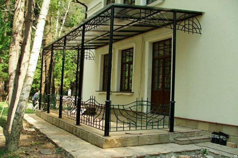 Обычно, если говорят о кованом или металлическом крыльце, то подразумевают декоративные части конструкции – навесы, перила, ступеньки, которые изготовлены на основе металла. Но иногда устанавливают и полностью металлическое крыльцо в частном доме.Основным преимуществом, которым обладают подобные конструкции, является повышенная прочность и продолжительность эксплуатации. Однако вам придется постоянно красить и обрабатывать крыльцо, чтобы оно не испортилось из-за коррозии. Более того, металлической пол будет достаточно холодным, поэтому он не подойдет для обустройства террасы. Последний вариант требует бетонной основы или настила дерева на основу из металла.