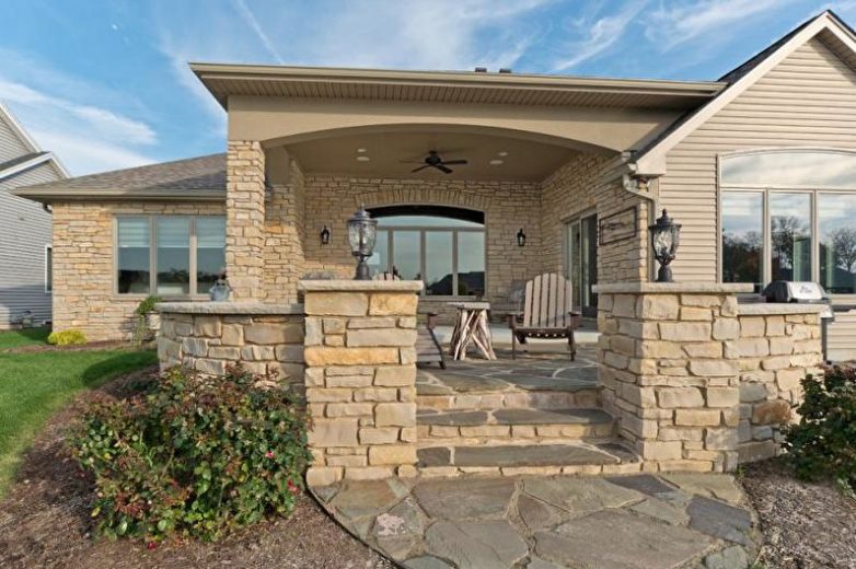 Натуральный камень считается классическим вариантом. Такое сырье отличается долговечностью эксплуатации, презентабельностью и прочностью, что особенно важно. Есть множество разновидностей камня, причем некоторые подойдут для основы, а ряд других – для создания декоративных элементов (причем сырье для изготовления основания обойдется значительно дороже). Хотя, в целом, все типы камня способны противодействовать неблагоприятным погодным условиям, и для него долго не потребуется дополнительное обслуживание.Если постройка каменная, то вы можете вписать в общую конструкцию крыльцо с колоннами. Натуральный камень можно сочетать с монументальными элементами. Такая композиция будет смотреться гармонично.