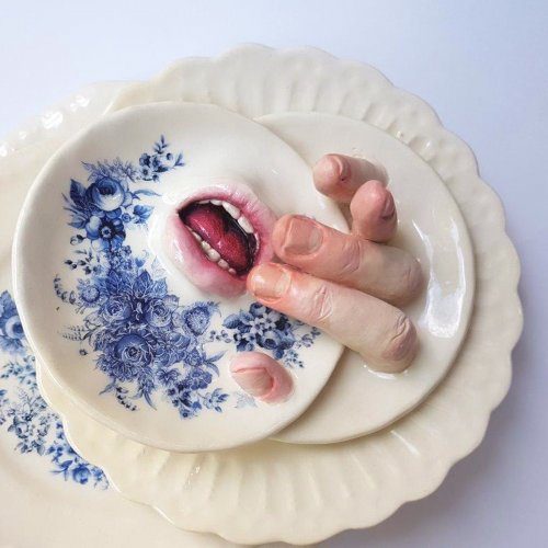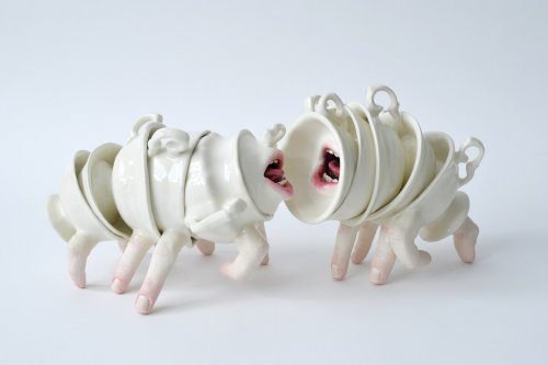 Открытые рты на дне блюдец и чашек; пальцы, вылезающие из сахарниц и чашек — сложно представить, что двигало израильской художницей в процессе работы. Очевидно одно: они не останутся незамеченными никем.