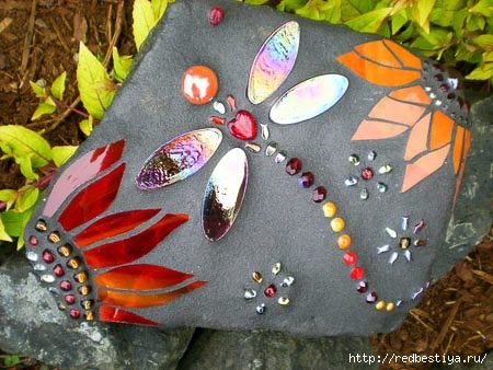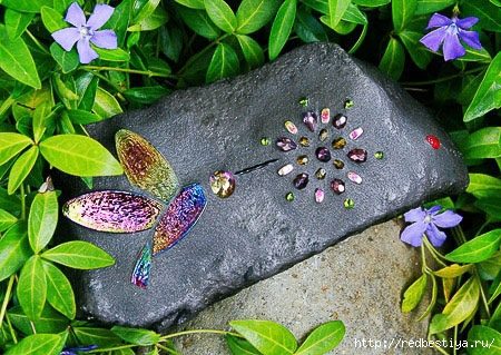Очень простая в исполнении мозаика. В ход идет все: стекляшки, бусины, красивые декоративные элементы, крылышки удобно делать из жидкого стекла — не дорого и быстро.