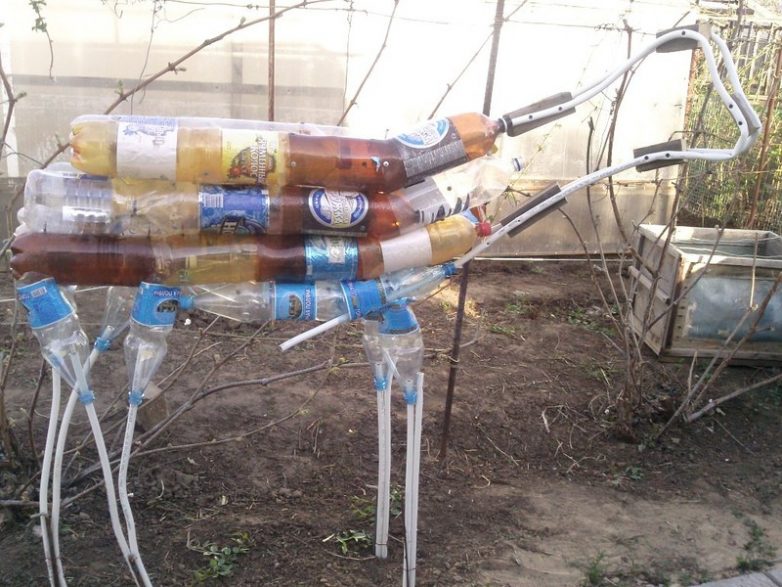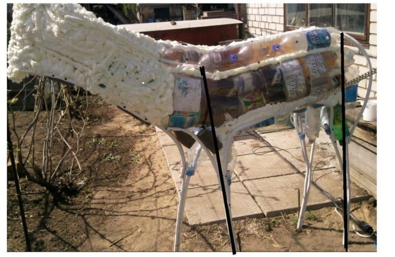 Каркас из металлопластика готов. Наполнителем послужат пластиковые бутылки. Шея и голова тоже из бутылок. Ноги укрепляем профтрубой.Прикручиваем к металлопластику саморезами.