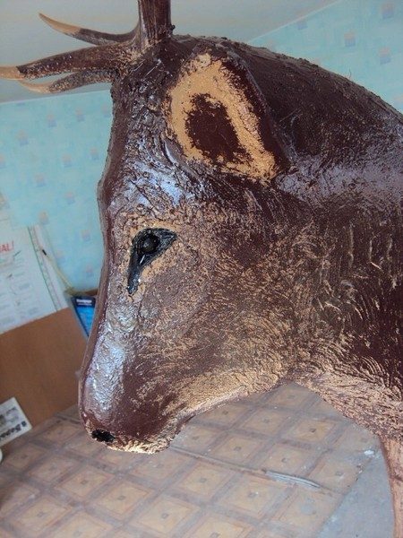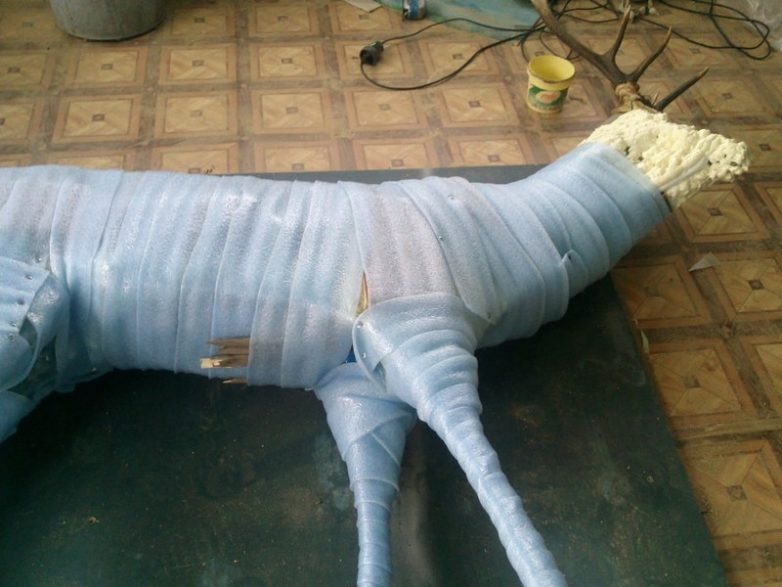 Обмазываем плиточным клеем. Обматываем серпянкой. Серпянку можно приобрести в строительных магазинах… типа бинта разной ширины… только сделана из тонкой лески… Обматываем оленя всего (с ног до головы).