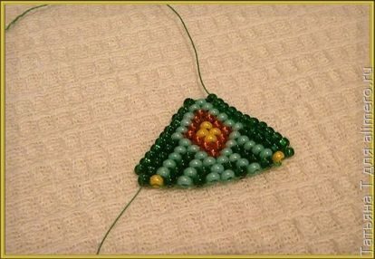 Я воспользовалась «кирпичным плетением», когда бисеринки в каждом ряду ложатся, словно кирпичная кладка. Так я плела лепестки для сережек в виде маков. В первом ряду у меня три бисеринки, в каждом следующем — на одну больше, чем в предыдущем. Так я сплела 11 рядов. В 11 ряду у меня получилось 13 бисеринок.