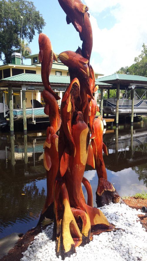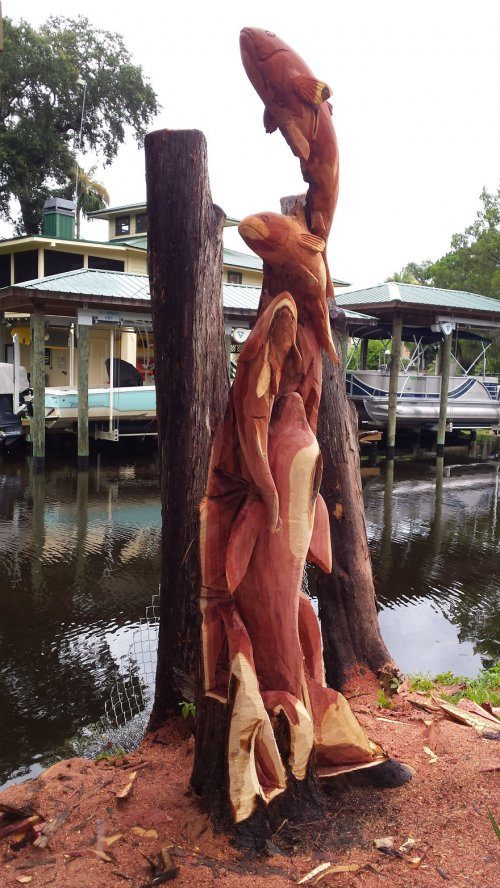 Посоветовавшись с хозяевами двора, он решил вырезать из каждого из стволов деревьев скульптурные композиции с дельфинами, кефалью и окунями (все они плавают в водах канала).