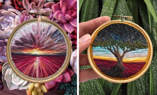 Художница по вышивке из Санкт-Петербурга является самоучкой (она училась на экономиста) и в качестве кисти для своих пейзажей использует иглу.