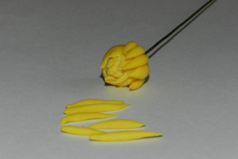 Из желтой глины формируем небольшие колбаски такой длины, чтобы они могли сравнятся по высоте с шариком. Это будут нераспустившиеся лепестки георгина. Крепим их по всей окружности шарика, промазав клеем нижнюю треть полоски.
