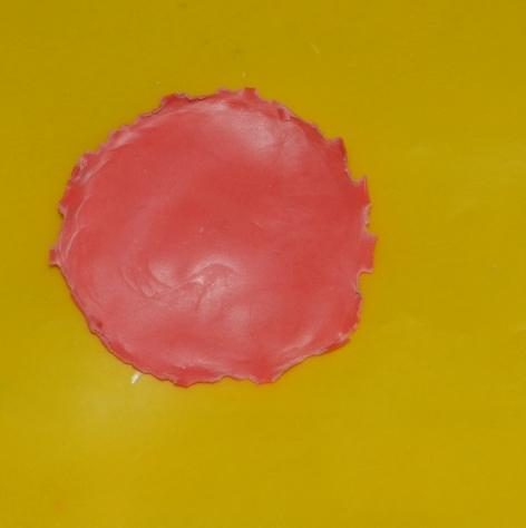 Окрашиваю глину красной краской и беру два кусочка, дин размером с лесной орех, второй чуть меньше. Раскатываю их скалкой до толщины, примерно, в 2-3 мм.