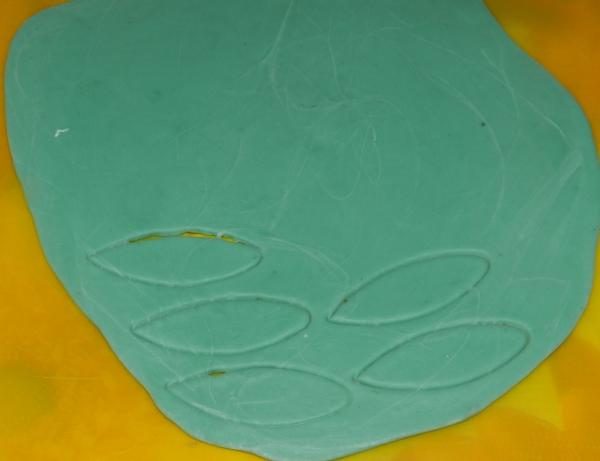 Делаем глину зеленого цвета, раскатываем ее толщиной в 3 мм, вырезаем обычные полукруглые лепестки. Это можно сделать резцом для глины и вырезать сразу несколько заготовок.