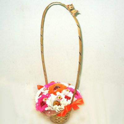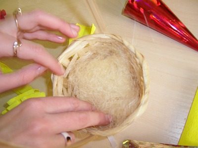 Для любой композиции из конфет нужно подготовить основу. Для этого обрежьте пенопласт или флористическую губку по размерам дна корзины и приклейте ее с помощью клеевого пистолета.