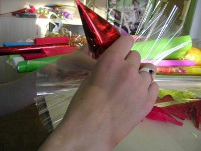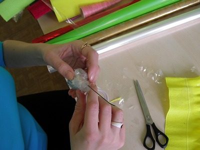 Технология их изготовления достаточно проста: отрезаем кусок декоративной плёнки 15*20 см, сворачиваем «кулёчком», закрепляем двусторонним скотчем на проволоке или палочке для барбекю.