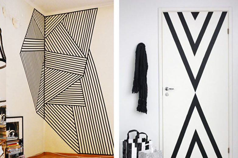 Бумажная лента подойдет скорее для современного дизайна, в котором столь необычные решения выглядят наиболее органично. При помощи скотча можно, к примеру, обвести предметы мебели, разнообразить однотонные поверхности, «написать» слова или фразы и даже осуществить зонирование.
