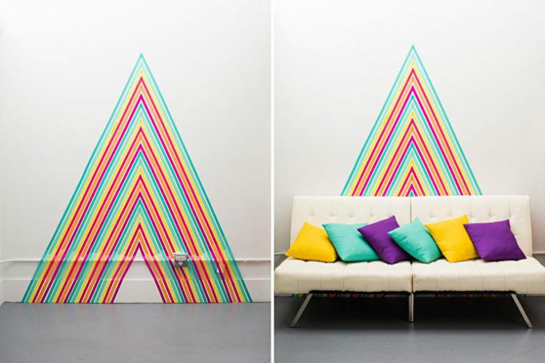 Скотчем можно не только склеивать бумагу, но и создавать эстетичные геометрические композиции в интерьере. Он намного удобнее в использовании, а вариативность цветов и узоров только расширяет возможности декора.Бумажная лента подойдет скорее для современного дизайна, в котором столь необычные решения выглядят наиболее органично. При помощи скотча можно, к примеру, обвести предметы мебели, разнообразить однотонные поверхности, «написать» слова или фразы и даже осуществить зонирование.