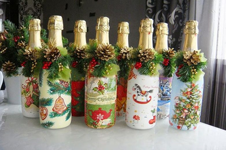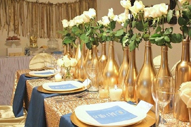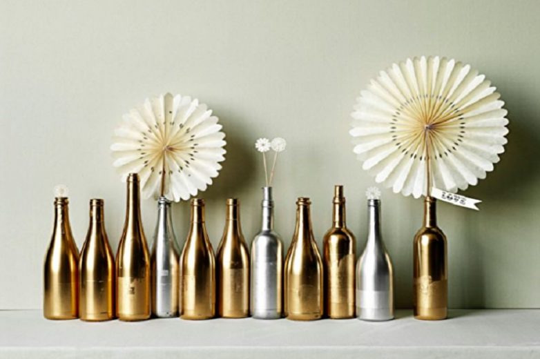 Мерцающая атрибутика добавит к новогоднему или свадебному столу ноты элегантной роскоши. Особенно приятно создать подобные украшения своими руками.Сперва необходимо удалить этикетки с бутылки при помощи средства для мытья посуды, либо прогрева феном. После того как сосуд будет подготовлен, расстелите бумагу, целлофан или ткань, и расположите на них емкости. Наденьте перчатки, чтобы ваши руки остались чисты. Переходим к покрытию золотой аэрозольной краской. Во избежание потеков, наносить ее необходимо на расстоянии примерно 10-15 сантиметров, не поднося баллончик слишком близко. Вам требуется нанести 2 слоя, после чего дайте изделию высохнуть.