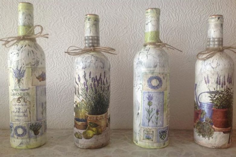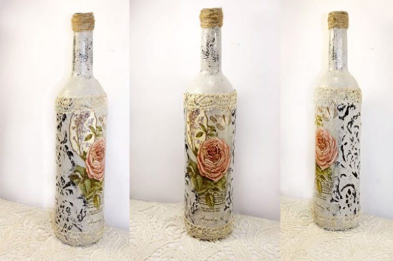 Просушите бутылку, окрасьте ее белым акрилом, и снова подсушите. В это время маникюрными ножницами обрежьте орнамент салфетки и очень осторожно отделите ее верхний слой. Получившееся изображение приложите к поверхности посуды и покройте салфетку акриловым лаком. Старайтесь работать быстро и аккуратно, иначе вы рискуете получить лишние складки и пузырьки. После того, как вещество подсохнет, наносите акрил выбранного оттенка на область вокруг рисунка, захватывая его границы. Снова просушите. Окрасьте завершающим слоем акрила и при желании продолжите декорирование мелкими элементами – кружево, бисер, блестки могут быть вполне уместны.