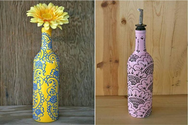 Еще один несложный способ декорирования, но отнюдь не менее привлекательный, чем другие. Выбрать можно прозрачные витражные, либо акриловые краски, для оформления внутреннего или наружного пространства.Окрашивание бутылки изнутри не требует особых навыков или инструментов. Подготовьте емкость, прокипятите ее, а затем высушите. После этих процедур, краску одного или нескольких цветов залейте внутрь. Для равномерного распределения, вращайте посудину до тех пор, пока не будут окрашены все участки.