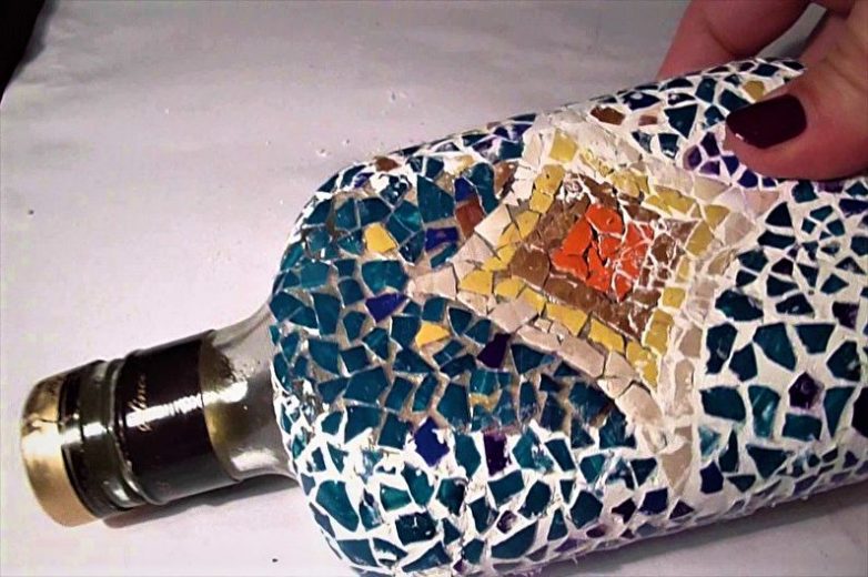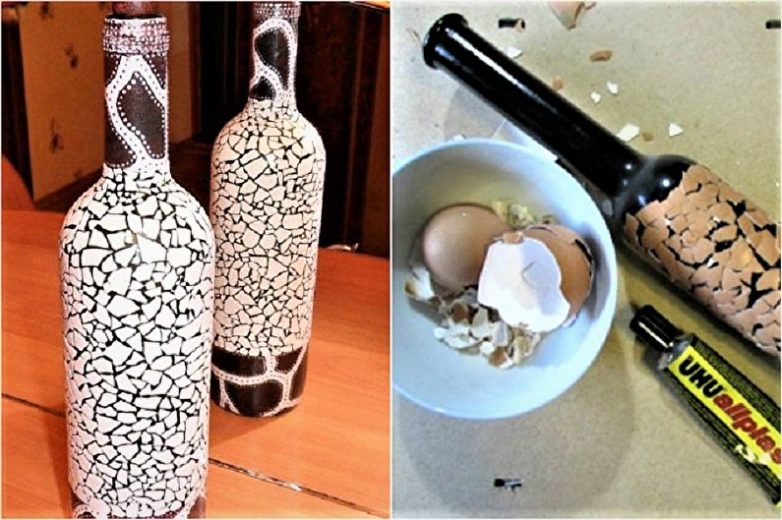 Начинайте с подготовки скорлупы – хорошо ее вымойте, очистите от пленки и просушите. Нанесите клей на стекло бутылки и выкладывайте узор. Сушите на протяжении 20 минут. Нанесите выбранный вами оттенок губкой, а если до некоторых участков будет сложно достать, воспользуйтесь кистью. Далее возьмите краску на тон темнее основной, и проработайте ею всю плоскость. Результат закрепите лаком.