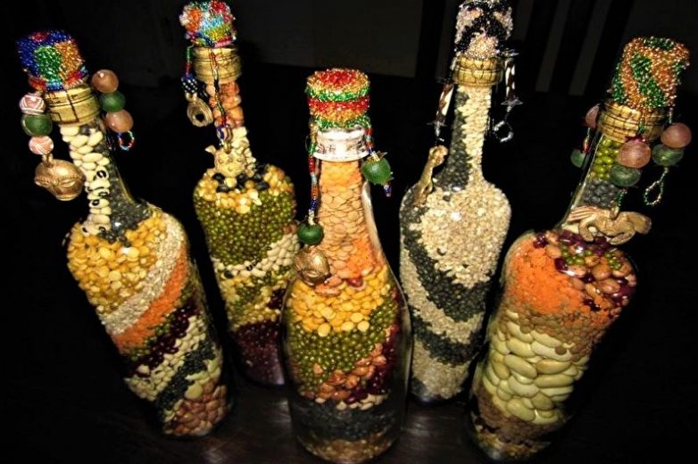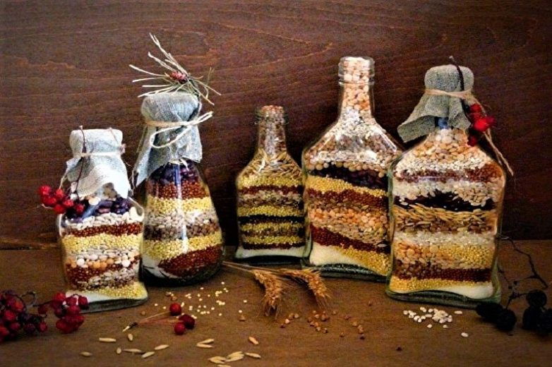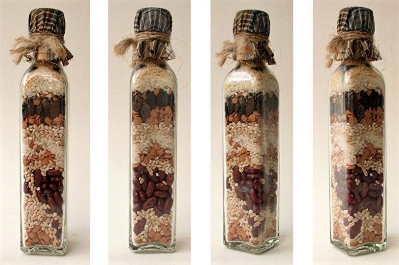 Такой вид декорирования бутылок по своему внешнему виду и методу исполнения напоминает декорирование солью, только вместо нее засыпаются пшено, гречка, пшеница, рис, горох, фасоль, чечевица и крупные специи. Все предельно просто: засыпаете каждую разновидность горстями так же, как и в случае с кристаллами соли. Готовые декорации визуально перекликаются также с декоративной консервацией, но в этом случае вы можете не опасаться внезапных взрывов при неблагоприятных температурах.