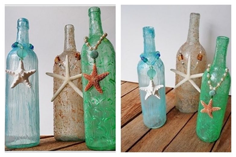 Свежий и легкий морской стиль предполагает детали, непосредственно связанные с данной тематикой. Среди них можно выделить декоративные ракушки. Оформленные с их помощью бутылки станут недорогим, но красивым дополнением вашего интерьера.Очистите сосуд и избавьтесь от этикеток. После этого покройте его клеем и обмотайте бечевкой. Оставьте на некоторое время для просушки. Затем нанесите клей на веревку и прикрепите к ней ракушки и камни. Частицы нужно прижимать до тех пор, пока они не зафиксируются. Для скрытия пробелов между ракушками посыпьте их песчаными частицами или осколками ракушек. После просушки закрепите работу лаком, он наделит изделие яркостью и блеском.