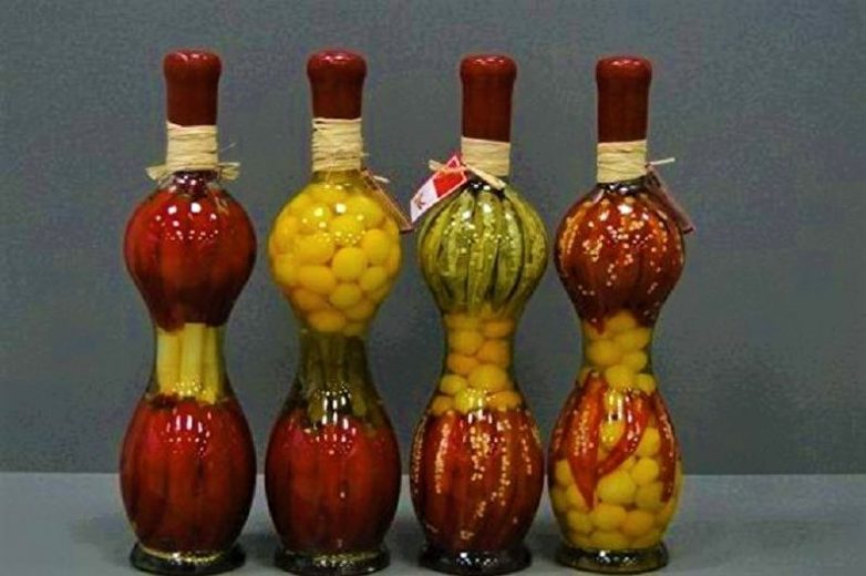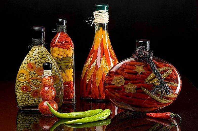 Декоративное консервирование – отличная альтернатива покраски и декупажу. Преображенное изделие будет смотреться натурально и естественно, органично вписываясь в кухонное оформление. Это не самый легкий метод, однако результат вас точно порадует, и вы не пожалеете затраченных усилий.Выберите прозрачную бутылку необычной формы, отделите этикетку и избавьтесь от клея, вымойте и тщательно простерилизуйте ее. Параллельно со стерилизацией подготовьте продукты (фрукты, овощи, специи), и в меру необходимости очистите их. Придумайте порядок и выкладывайте ингредиенты следуя ему. Лучше всего чередовать продукты разного цвета и размеров.