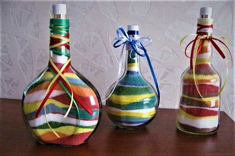 Для начала возьмите бутылку красивой формы и очистите ее от этикеток. Затем приступайте к обработке соли. Ее можно выкрасить краской или мелом. Разделите общую массу на несколько частей, а после окрасьте каждую из них акрилом или гуашью в разный цвет, перемешайте. Просушите образовавшуюся массу – сделайте это традиционным способом, либо прогрейте в духовке в течение часа.
