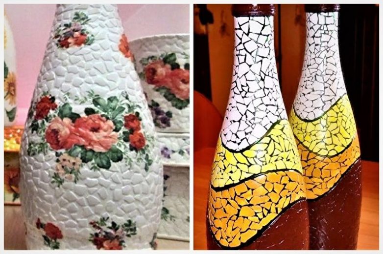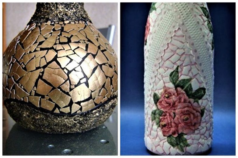 Яичная скорлупа способна придать интересную рельефную фактуру. Существует множество вариаций преображений этим методом, но в целом, принцип создания такого объекта декора для любой модификации один и тот же.Начинайте с подготовки скорлупы – хорошо ее вымойте, очистите от пленки и просушите. Нанесите клей на стекло бутылки и выкладывайте узор. Сушите на протяжении 20 минут. Нанесите выбранный вами оттенок губкой, а если до некоторых участков будет сложно достать, воспользуйтесь кистью. Далее возьмите краску на тон темнее основной, и проработайте ею всю плоскость. Результат закрепите лаком.