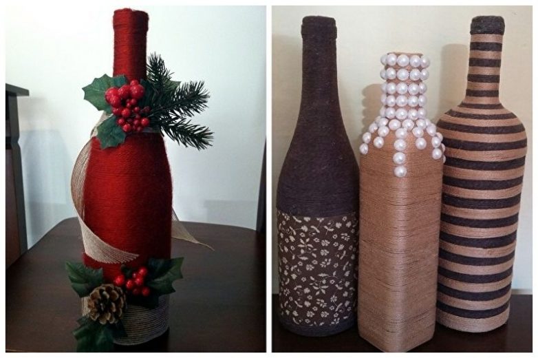 Очень современно выглядят бутылки, обтянутые шпагатом. Они замечательно дополнят любой интерьер в морском, деревенском, скандинавском стиле, либо станут дополнением к праздничному антуражу.Как и в других случаях, первый этап работ состоит в удаления этикетки и тщательного промывания, просушки. Смочите внутреннюю сторону шпагата клеем и плотно обматывайте изделие нитями. После того, как клеящее вещество высохнет, при необходимости продолжите украшение, к примеру, якорями и спасательными кругами для морского стиля, либо кружевом для стиля шебби-шик. Стоит отметить, что и при декорировании одним лишь шпагатом получается достаточно самобытный и интересный предмет, прекрасно вписывающийся практически в любое помещение.
